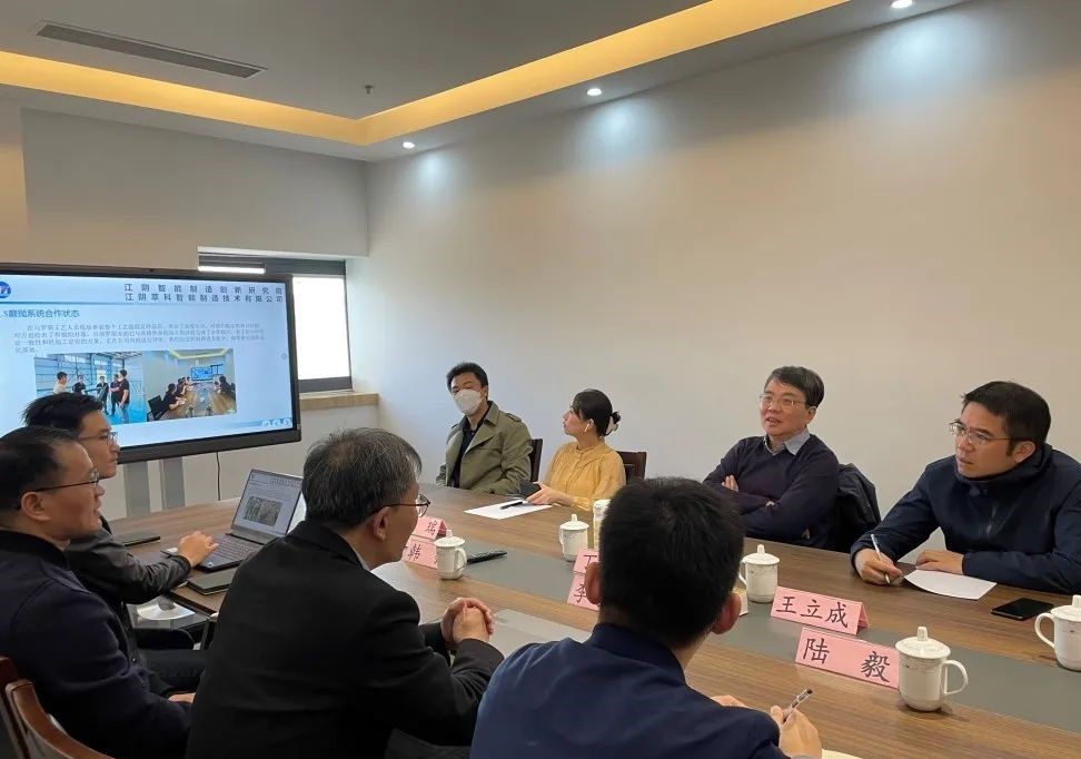 丁院士一行參觀了江陰院“兩機”高端制造中心、增材制造中心、機器人切割打磨工作站、智慧中央空調(diào)系統(tǒng)機房等,隨后舉行了工作座談會。省產(chǎn)研院數(shù)字所副所長、江陰院負責人李進儀、江陰院總工韓鋒博士及有關代表參加此次座談會。