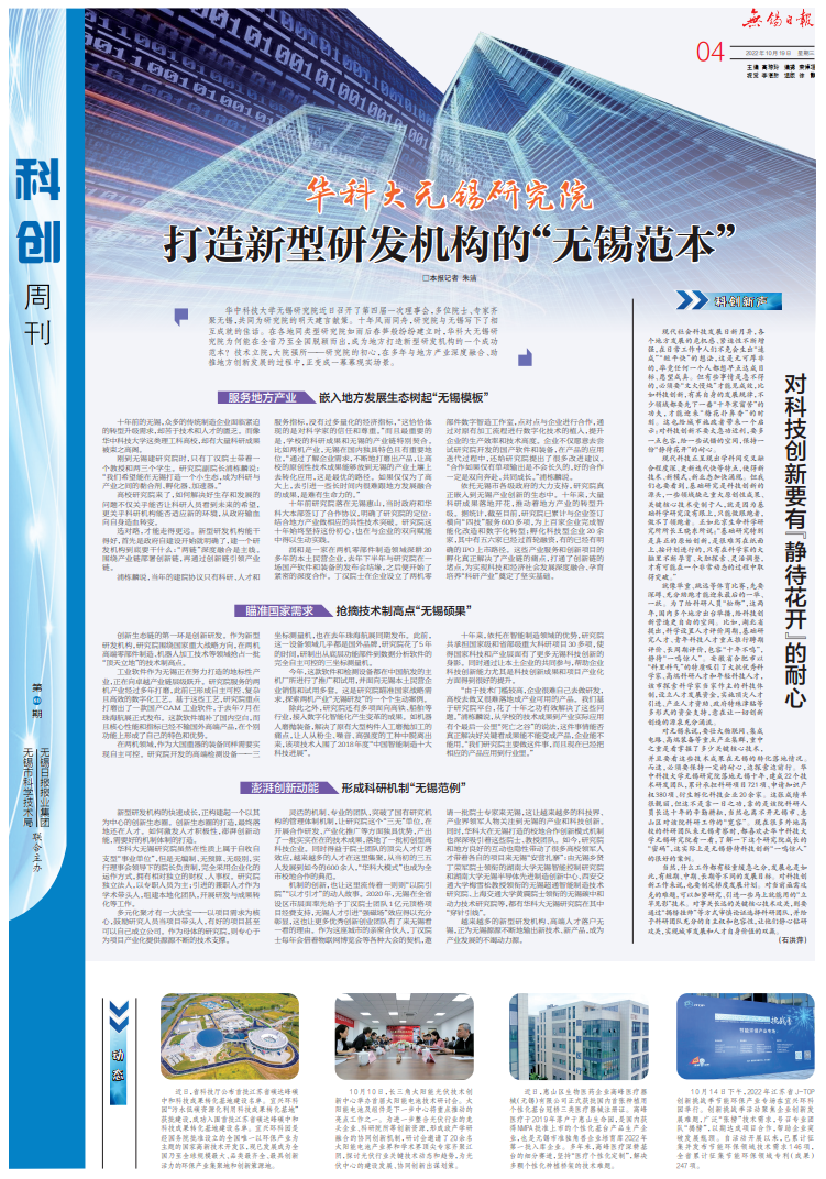 機(jī)制的創(chuàng)新,也讓這里流傳著一則則“以院引院”“以才引才”的動(dòng)人故事。2020年,無(wú)錫在全省設(shè)區(qū)市層面率先給予丁漢院士團(tuán)隊(duì)1億元頂格項(xiàng)目經(jīng)費(fèi)支持,無(wú)錫人才引進(jìn)“強(qiáng)磁場(chǎng)”效應(yīng)得以充分彰顯,這也讓更多優(yōu)秀創(chuàng)新創(chuàng)業(yè)團(tuán)隊(duì)有了來(lái)無(wú)錫看一看的理由。作為這座城市的親密合伙人,丁漢院士每年會(huì)借著物聯(lián)網(wǎng)博覽會(huì)等各種大會(huì)的契機(jī),邀請(qǐng)一批院士專家來(lái)無(wú)錫,這讓越來(lái)越多的科技界、產(chǎn)業(yè)界領(lǐng)軍人物關(guān)注到無(wú)錫的產(chǎn)業(yè)和科技創(chuàng)新。同時(shí),華科大在無(wú)錫打造的校地合作創(chuàng)新模式機(jī)制也深深吸引著這些院士、教授團(tuán)隊(duì)。如今,研究院和地方良好的互動(dòng)也隱性帶動(dòng)了很多高校領(lǐng)軍人才帶著各自的項(xiàng)目來(lái)無(wú)錫“安營(yíng)扎寨”:由無(wú)錫鄉(xiāng)賢丁榮軍院士領(lǐng)銜的湖南大學(xué)無(wú)錫智能控制研究院和湖南大學(xué)無(wú)錫半導(dǎo)體先進(jìn)制造創(chuàng)新中心、西安交通大學(xué)梅雪松教授領(lǐng)銜的無(wú)錫超通智能制造技術(shù)研究院、上海交通大學(xué)黃震院士領(lǐng)銜的無(wú)錫碳中和動(dòng)力技術(shù)研究院等,都有華科大無(wú)錫研究院在其中“穿針引線”。
