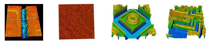應(yīng)用白光干涉技術(shù),獲取wafer表面的3D形貌、表面粗糙度、TSV等關(guān)鍵尺寸的相關(guān)數(shù)據(jù),可對(duì)各種產(chǎn)品、部件和材料表面的粗糙度、波紋度、面形輪廓、表面缺陷、磨損情況、腐蝕情況、孔隙間隙、臺(tái)階高度、加工情況等表面形貌特征進(jìn)行測(cè)量和分析。以下圖片展示了該項(xiàng)技術(shù)在幾種不同材料上對(duì)不同參數(shù)進(jìn)行測(cè)量的應(yīng)用案例。