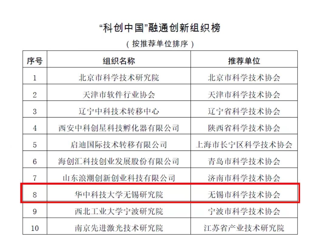 日前,中國科協(xié)公布了2022年“科創(chuàng)中國”系列榜單遴選結(jié)果,華中科技大學(xué)無錫研究院榮登2022年“科創(chuàng)中國”融通創(chuàng)新組織榜(全國共10家)。