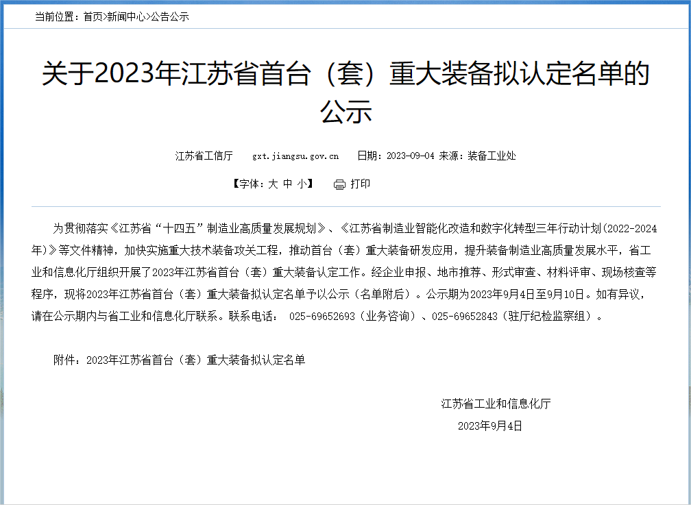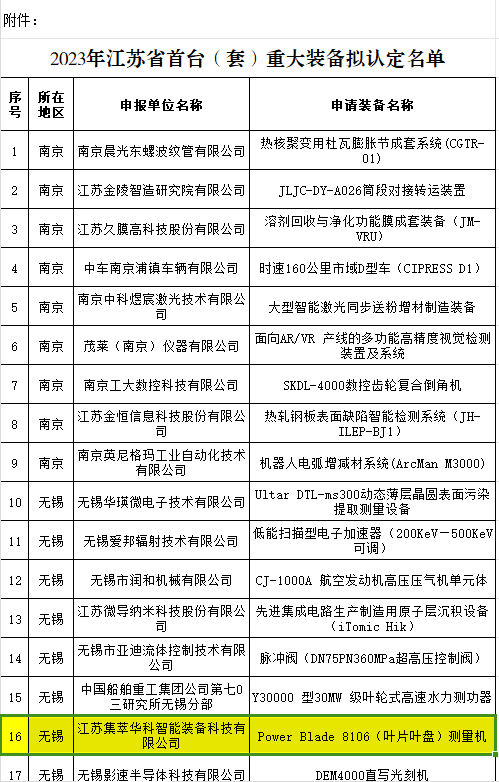 近日,江蘇省工業(yè)和信息化廳發(fā)布的《2023年江蘇省首臺(套)重大裝備擬認(rèn)定名單》已完成公示,江蘇集萃華科智能裝備科技有限公司“Power Blade 8106(葉片葉盤)測量機(jī)”順利入選2023年江蘇省首臺(套)重大裝備。